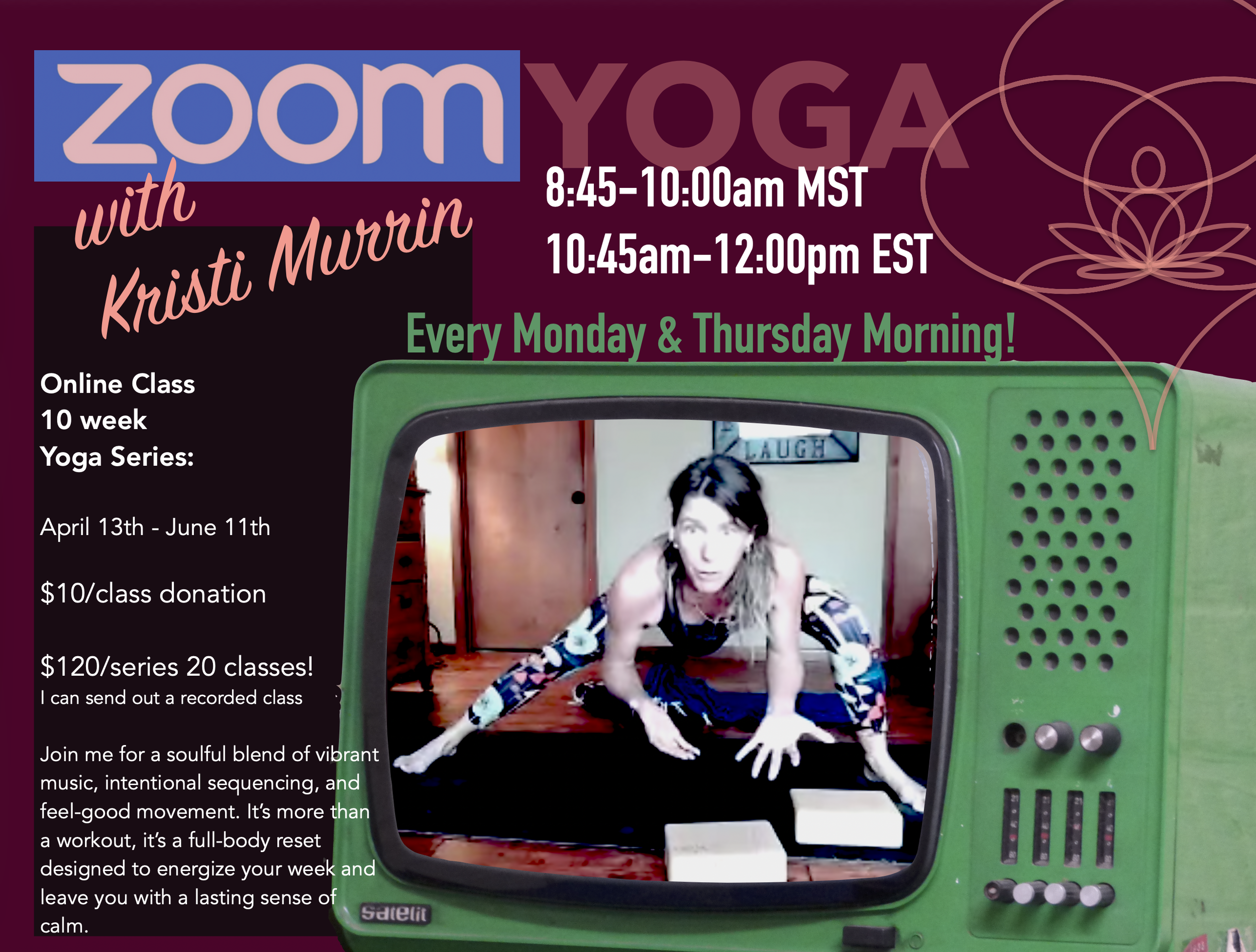Joining is simple. There is no formal registration required, just hop onto the Zoom link below a few minutes before class starts so I can greet you!